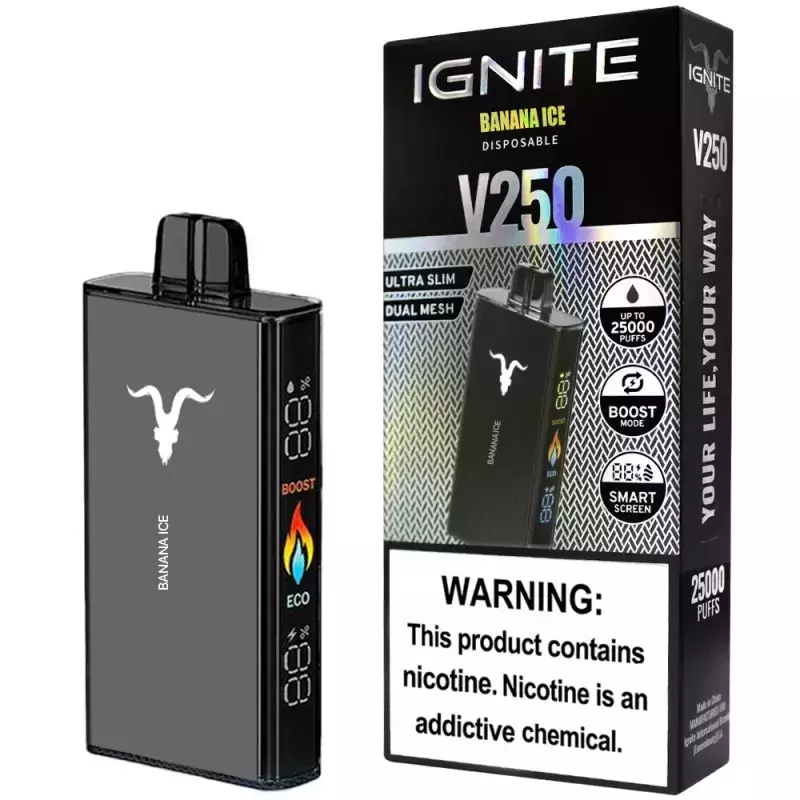 ModeloIgnite V250SaborBanana IceBatería650mAh (recargable)AlimentaciónA través de USB-C (cable no incluido)CapacidadHasta 25.000 PuffsConcentración≤ 5% de NicotinaVolumen16mLDisplayPantallaLED Smart screen: indica estado de bateria